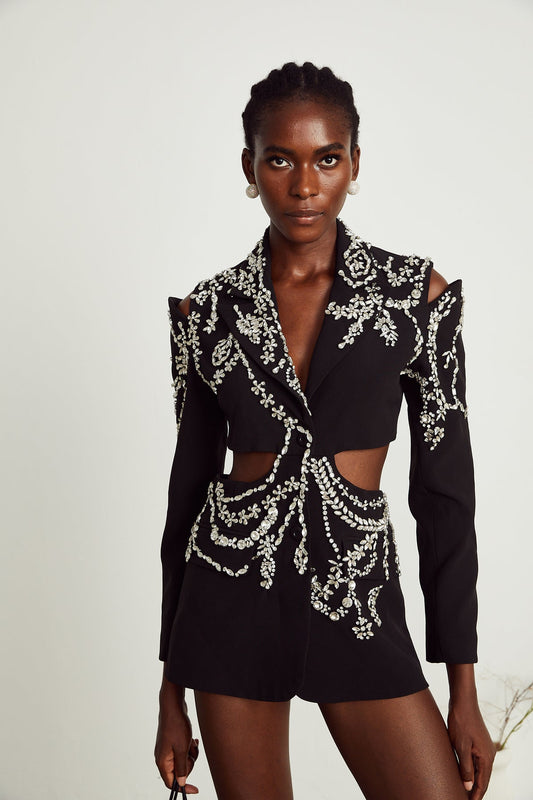 Deep V Neck Bling Rhinestone Pearl Blazer