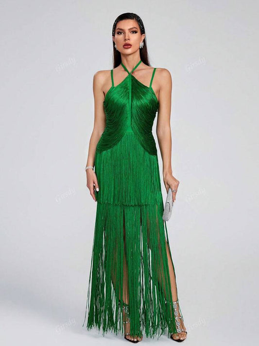 Spaghetti Strap Halter Neck Long Tassel Maxi Bandage Dress