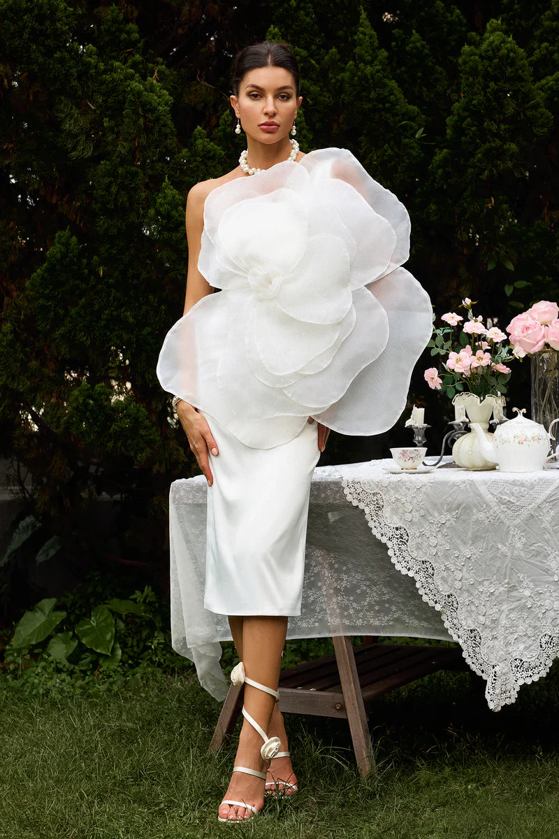 Expertly designed for a stunning look, this one shoulder dress features a large flower accent that adds a touch of elegance. The asymmetrical design provides a flattering fit, perfect for any special occasion. Made with high-quality materials, this dress guarantees both style and comfort.