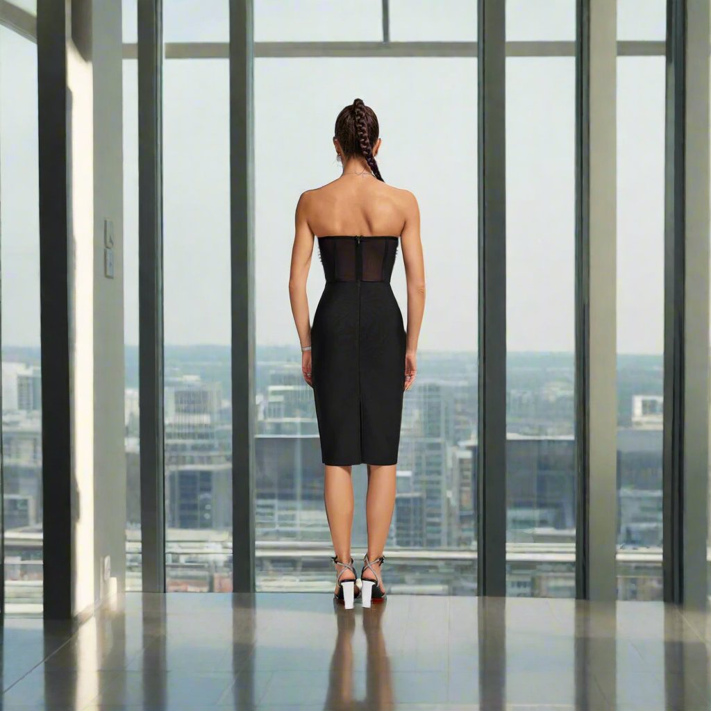“This form-fitting strapless dress features a delicate leaf pattern and a bandage design that accentuates your curves. Perfect for a night out, the strapless style showcases your shoulders while the bandage fabric gives a slimming effect.”