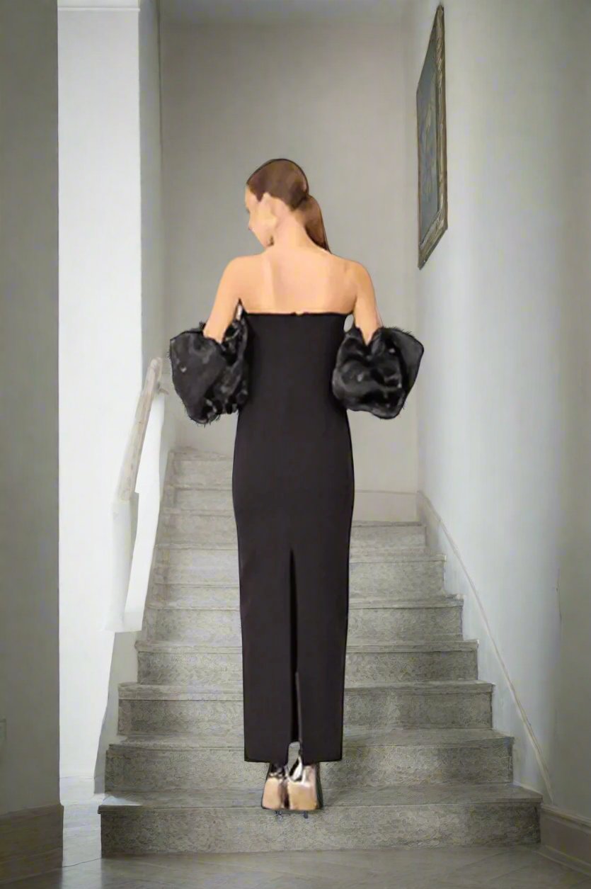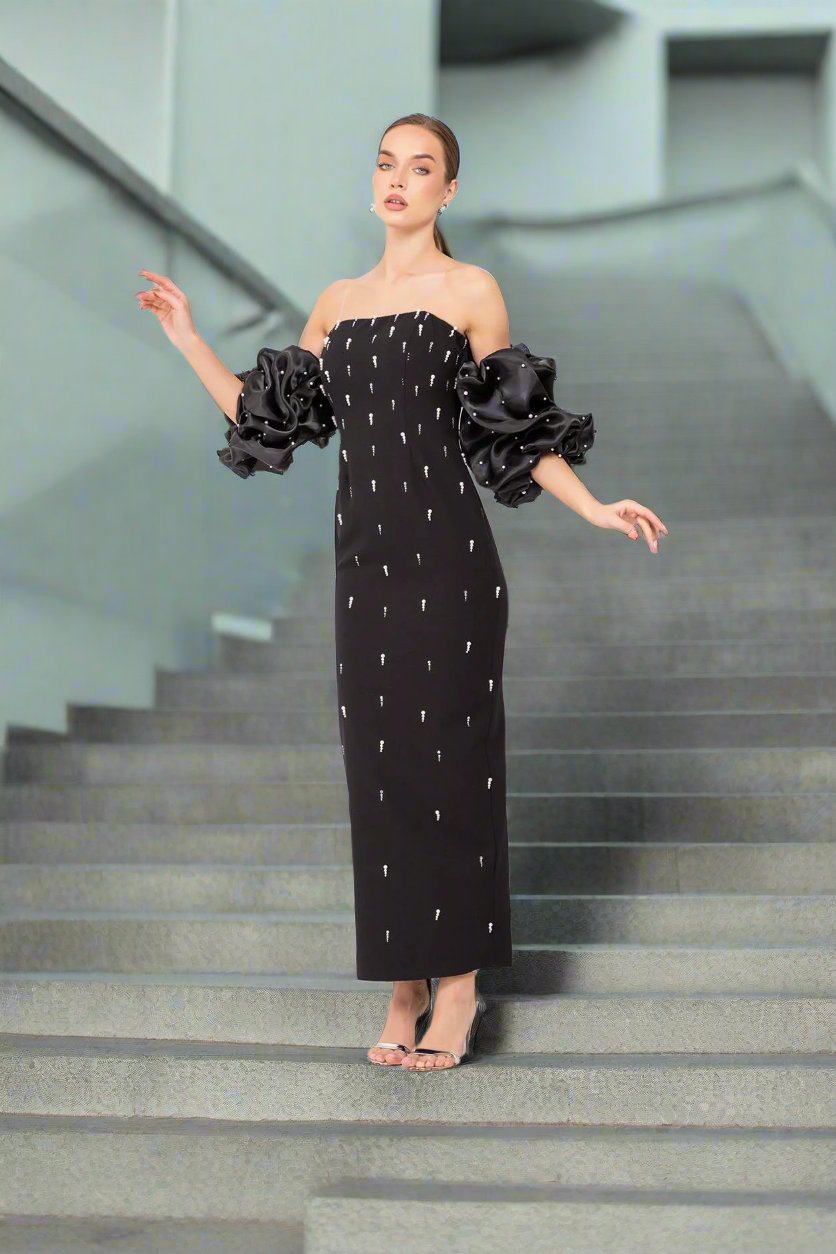 Experience elegance and sophistication in our Strapless Ruffle Sleeve Pearl Embroidered Bandage Dress. The strapless design accentuates your natural curves while the ruffle sleeves add a touch of femininity. Embroidered with delicate pearls, this bandage dress is sure to make a statement at any event.